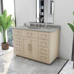 Ideal for a contemporary-style master bathroom, the Barrett Bathroom Vanity is a stylish addition to your home. Eight spacious, soft-close drawers run along the side of the vanity, and an under-the-sink cabinet with two shelves offers plenty of space for necessities. This modern bathroom vanity combines smooth, quiet functionality with an expertly crafted, solid wood design.