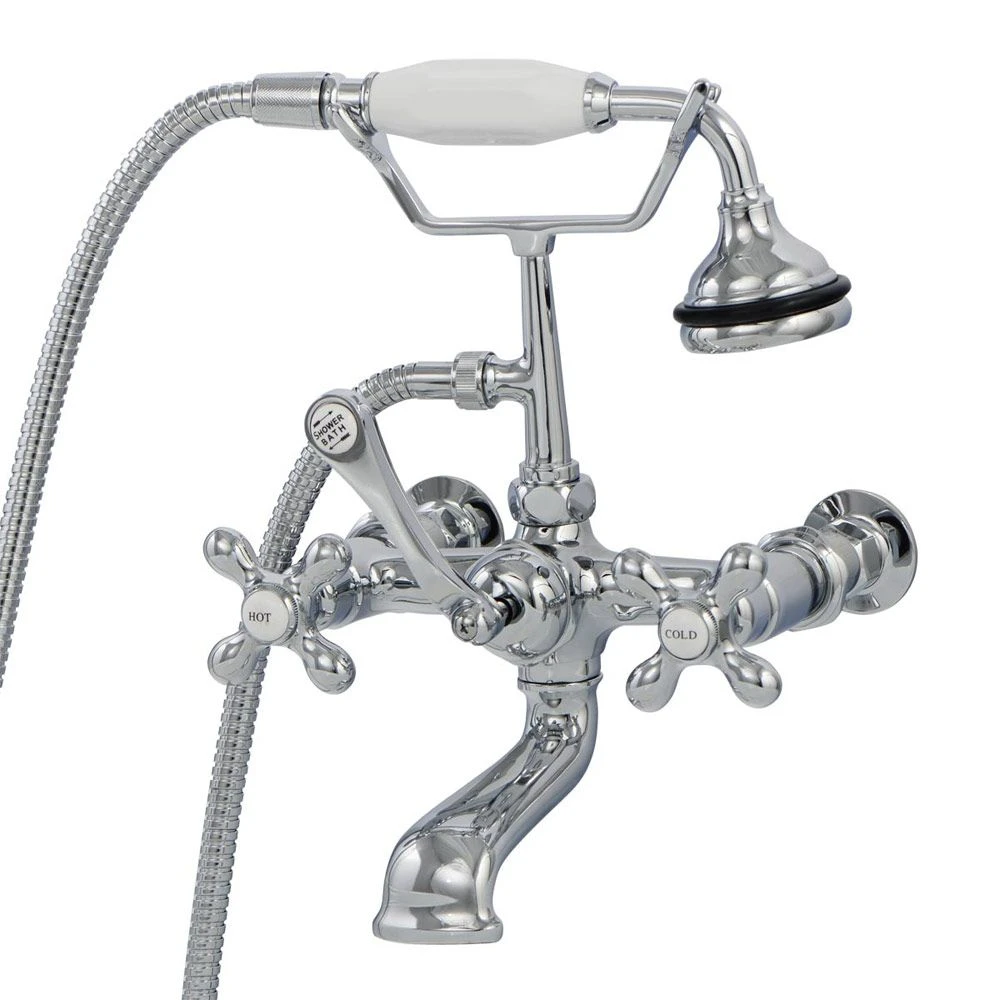 Add a beautiful bathtub wall mount faucet to your master bath. Constructed solid brass, guaranteeing a long-lasting, durable design. The metal cross handles feature premium porcelain lettered inlays, while the hand shower has a stunning porcelain handle. The shower diverter allows for easily switching from the stately low spout to the shower. Update your bathtub today!