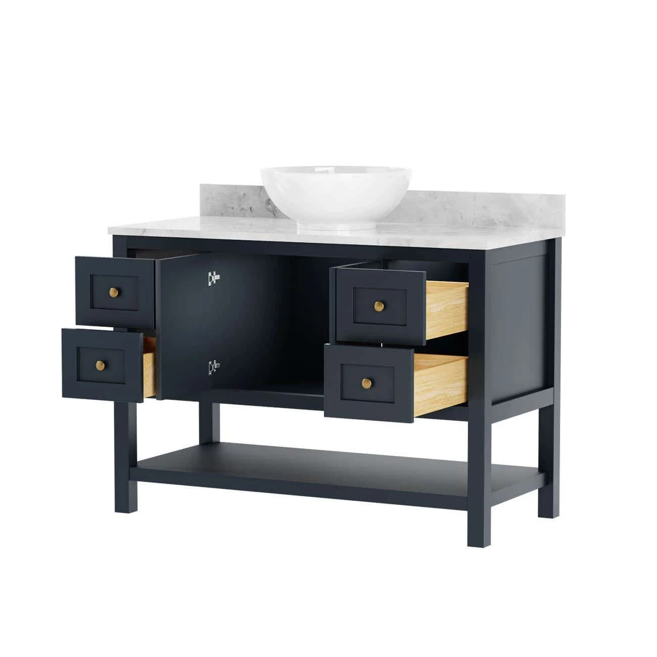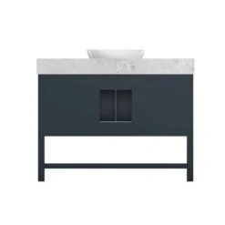 This modern console vanity features an elegant porcelain vessel sink atop a matte navy blue finish. The wood vanity sink is built to last with mortise and tenon joints and a special seal that keeps moisture out. It’s a compact 48 inch sink, so it easily fits into even small bathrooms.