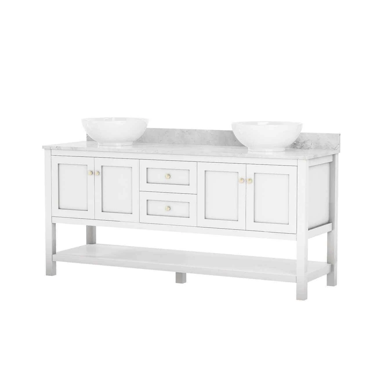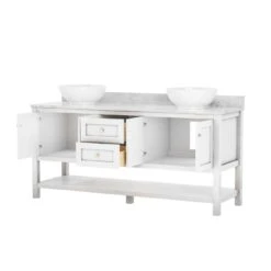 This solid wood vanity sink will add the perfect touch to classic and modern bathrooms alike. The double vessel sink is perfect for letting two people prepare for the day at once. The modern console vanity is a 72 inch sink, so there’s ample storage space for all your essentials. It comes in a white finish.