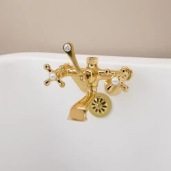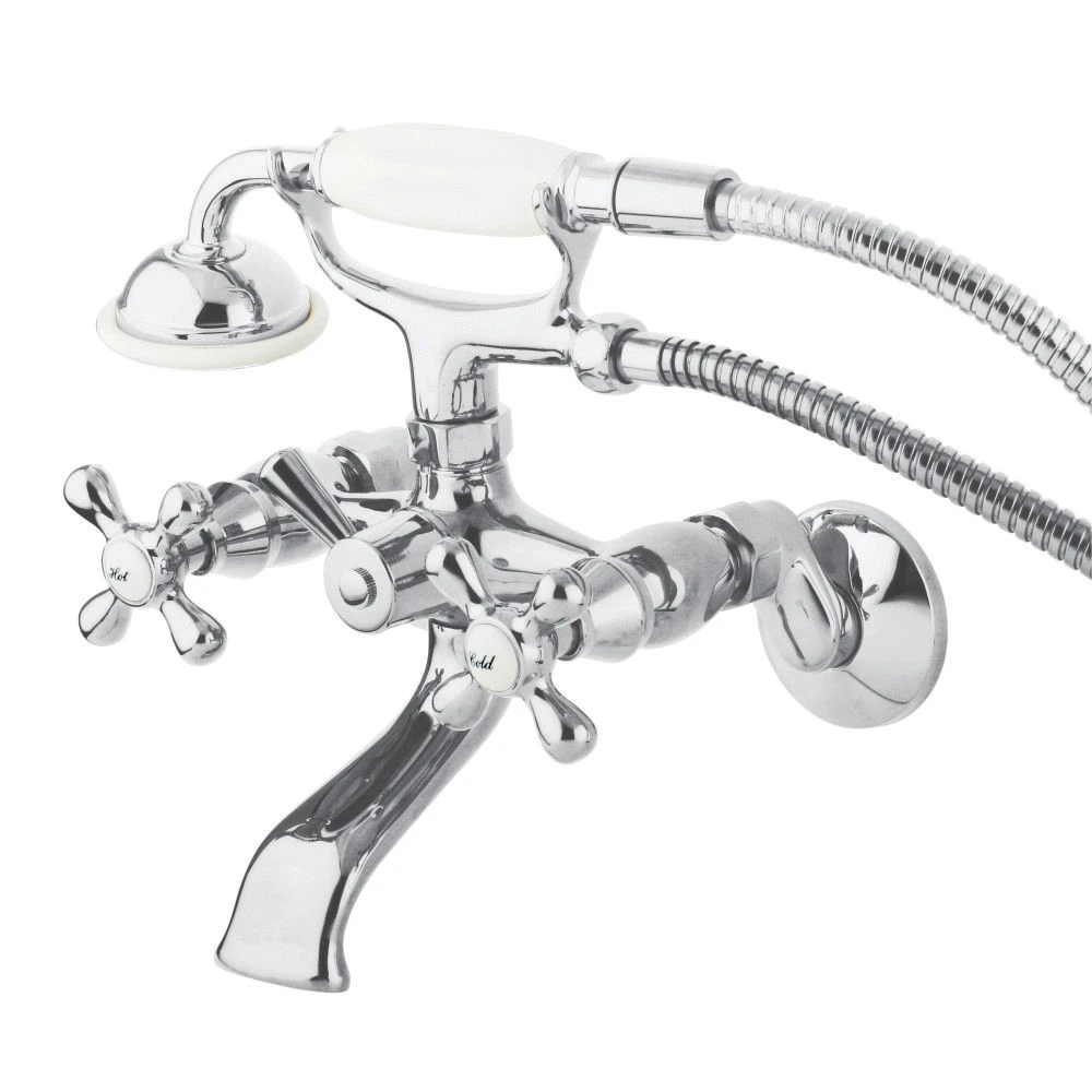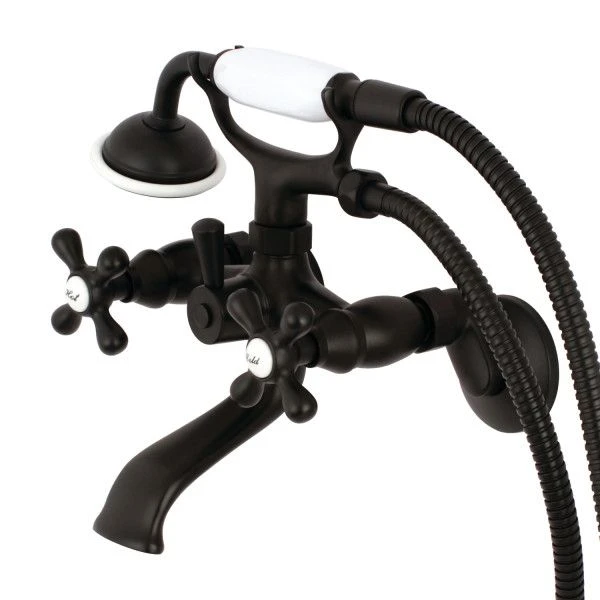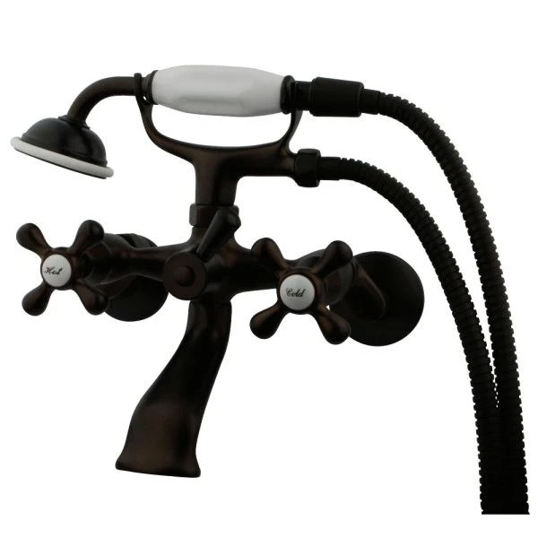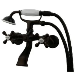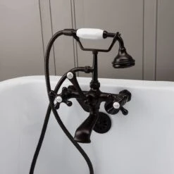 Fill your clawfoot tub with this Victorian Clawfoot Tub Filler with Hand Shower. Designed for tub wall-mount installations, this faucet will fit anything between 3-1/2″ – 8-1/2″ centers. This tub filler is constructed from solid brass for outstanding performance and durability. The hand shower is attached to a 59″ hose allowing you to pull it far out to use. The faucet is available 8 tarnish and corrosion resistant finishes: Brushed Nickel, Chrome, Matte Black, Oil Rubbed Bronze, Polished Brass, Polished Nickel, Satin Brass and Vintage Brass. This tub filler will complete your clawfoot tub and transform your bathroom to a luxury getaway.