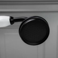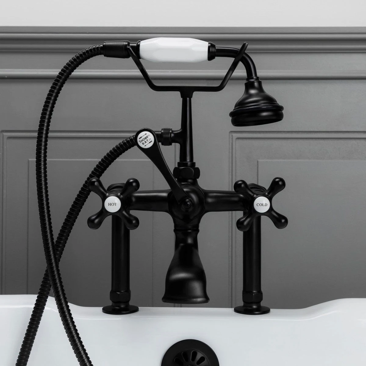 Beautiful in its style, the rim mount faucet boasts solid brass construction with porcelain inserts on the water and shower handles. The telephone faucet with handshower provides every luxury needed in your bathroom suite.