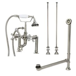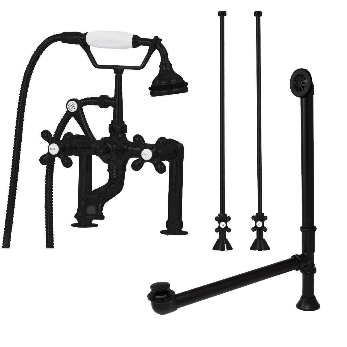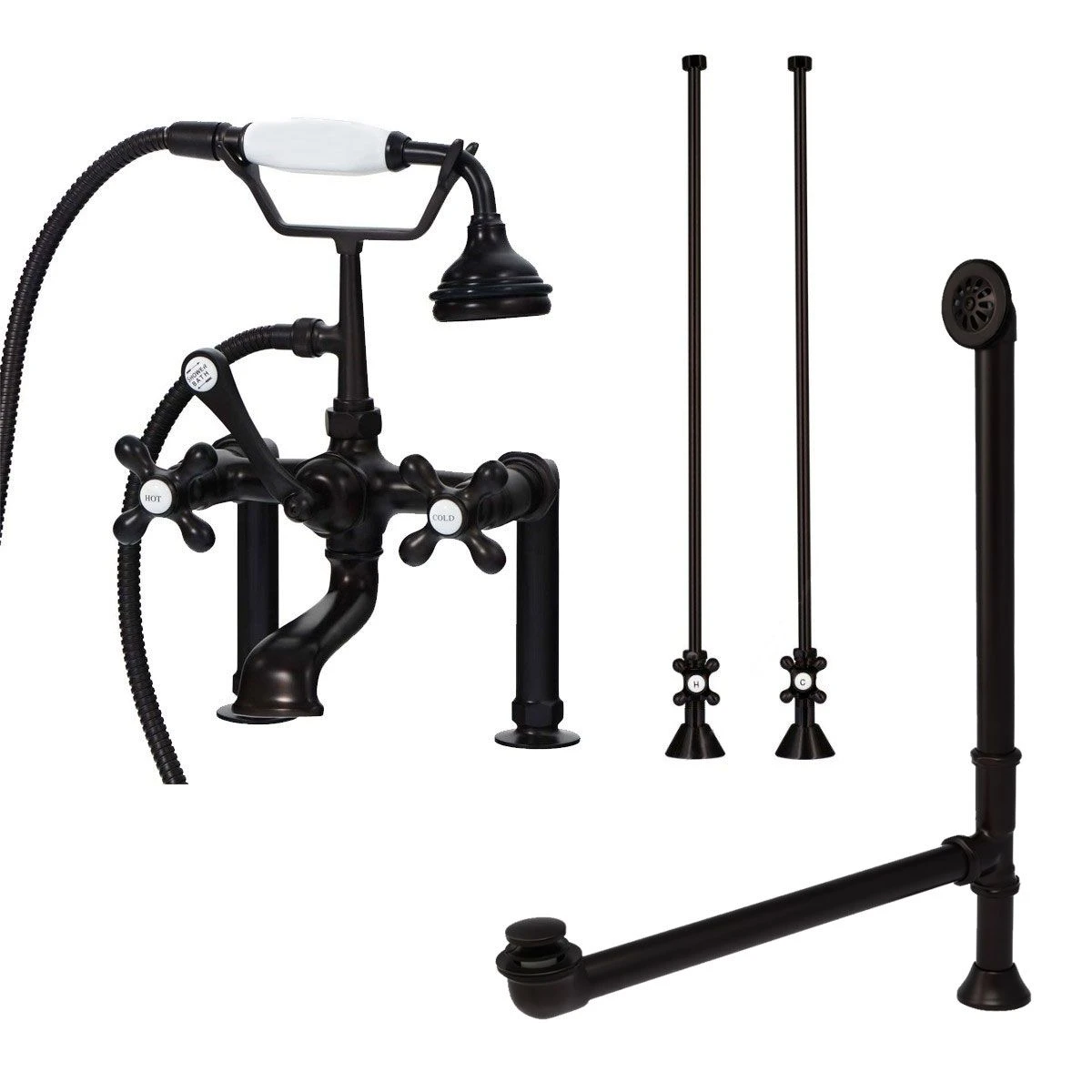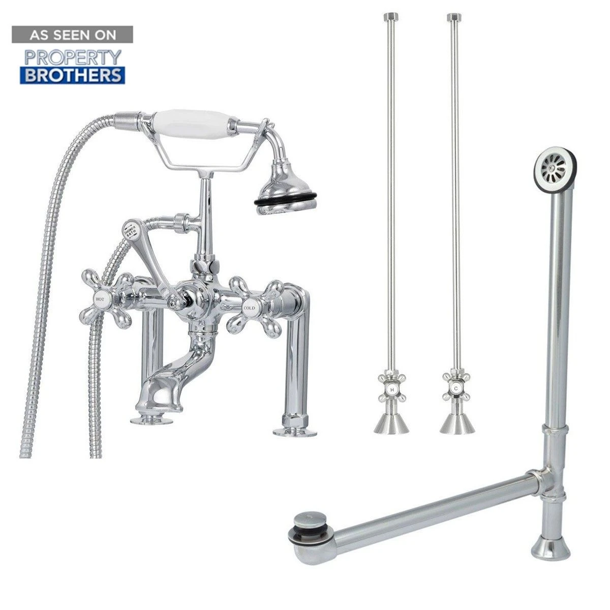 - Set includes: Clawfoot Tub Faucet with Hand Shower, Toe Tapper Pop-Up Tub Drain, and Straight Supply Lines with Shut Off Valves