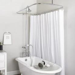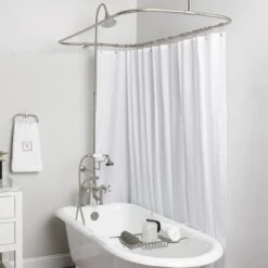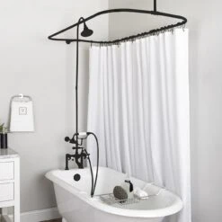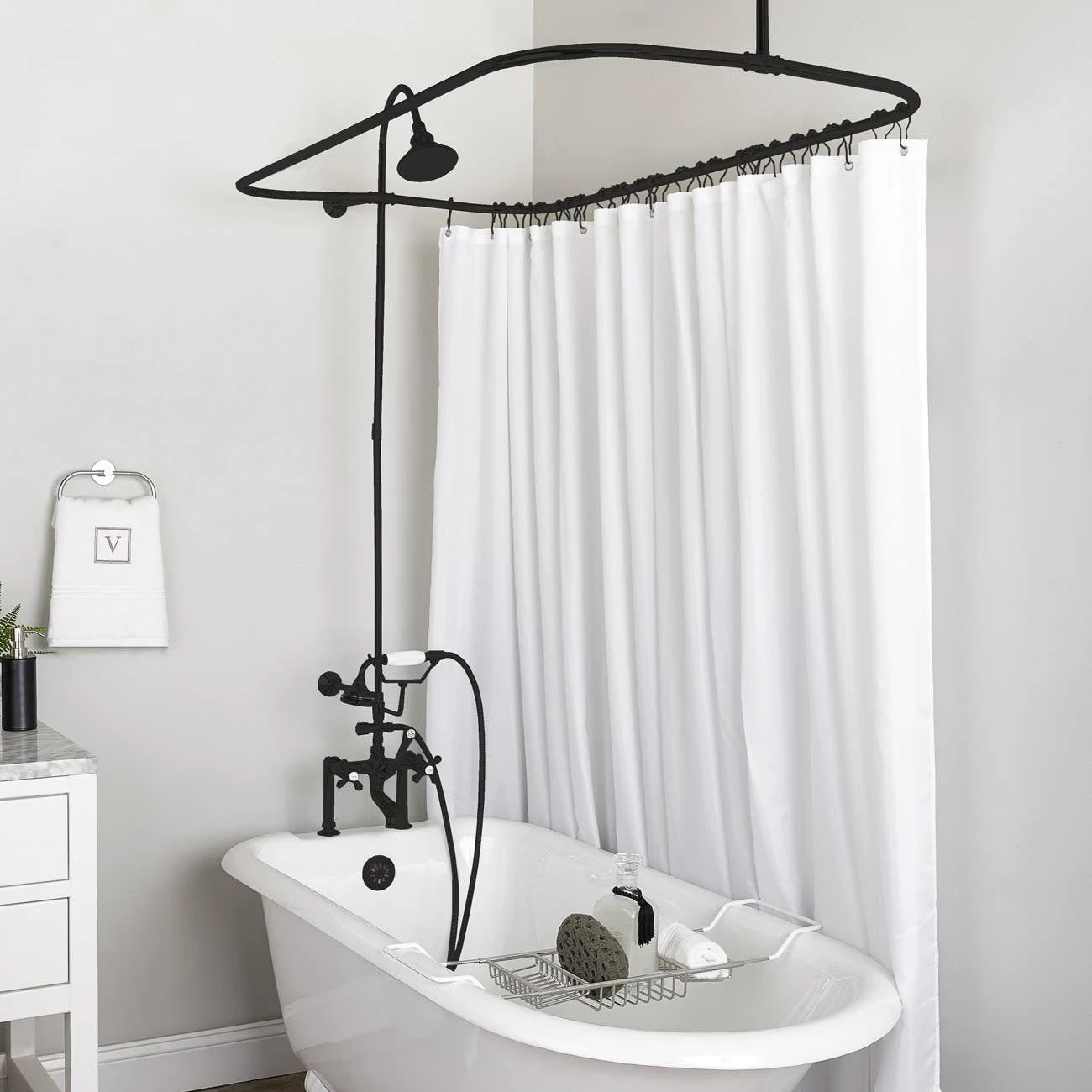 Upgrade your clawfoot tub with a shower enclosure. This shower set includes a rim-mounted tub faucet, enclosure ring and supports, riser pipe, your choice of showerhead, hand shower, diverter, and riser-mounted cradle. The enclosure is designed to mount to the rim of your bathtub and secure to the ceiling and wall with heavy-duty support tubes. The premium solid brass construction offers a corrosion and rust-resistant finish.