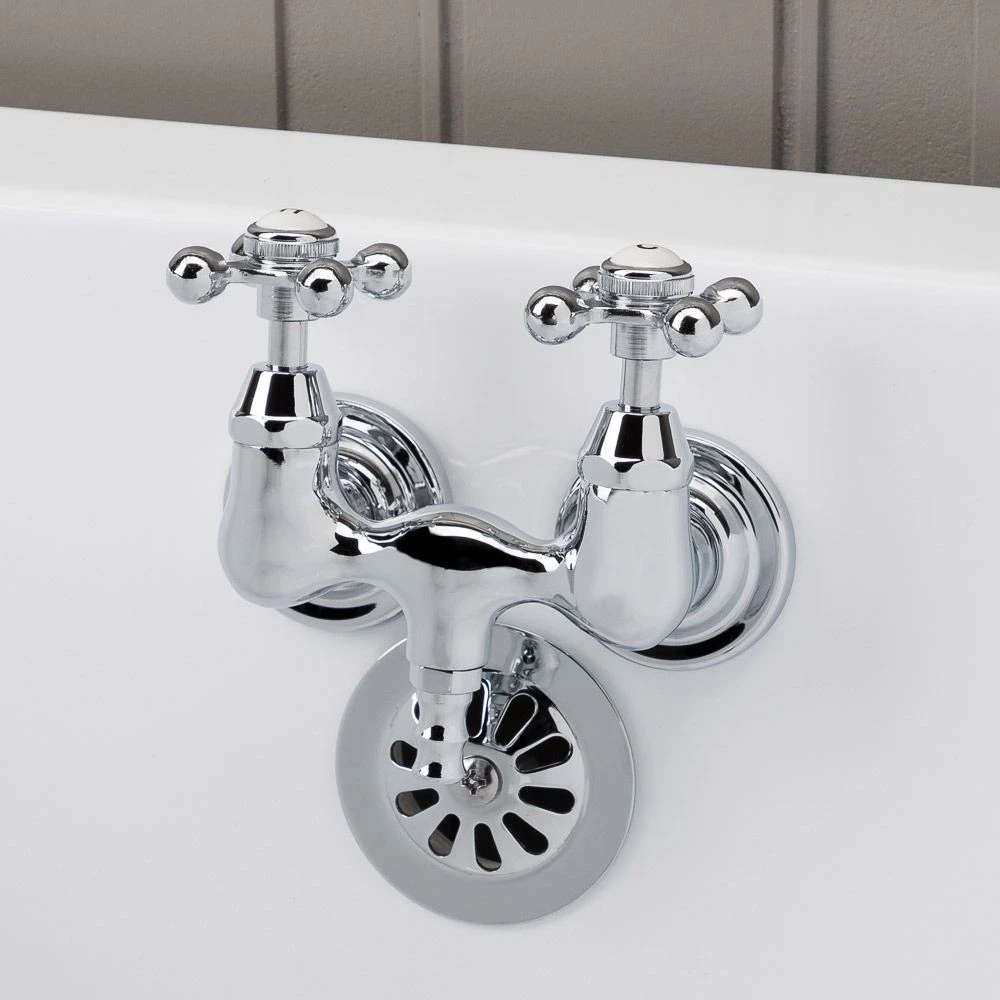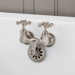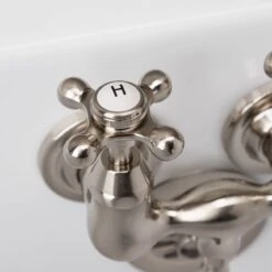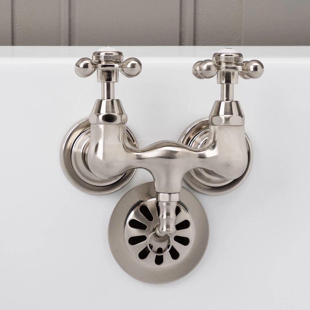 This clawfoot tub wall mount faucet is a beautiful addition to any bathtub. With metal cross handles featuring porcelain inserts labeled hot and cold, this bathtub faucet is a perfect addition to your design. With a solid brass construction and drip-free operation, this faucet allows for a flawless, dream bathroom.