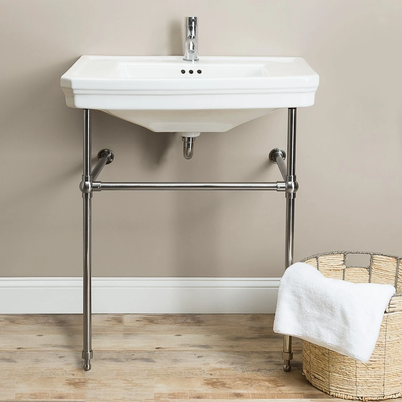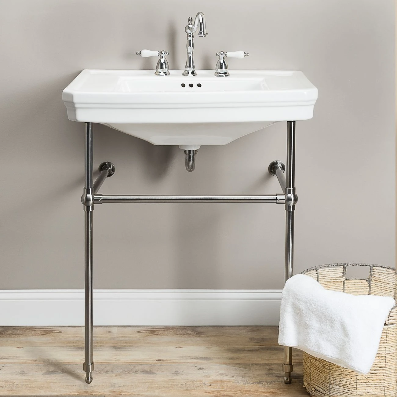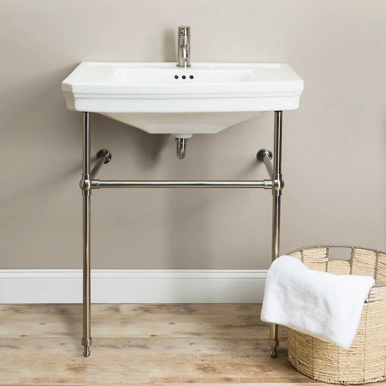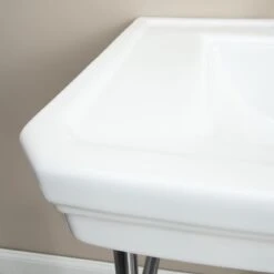 The console bathroom sink offers beautiful porcelain and brass look. The contrast that is achieved with the stark white basin and the highly polished metal base complements every bathroom. The square sink with decorative trim provides convenience yet makes a bold statement about style and functionality. This sink is as much a focal piece as it is an essential part of the bathroom.