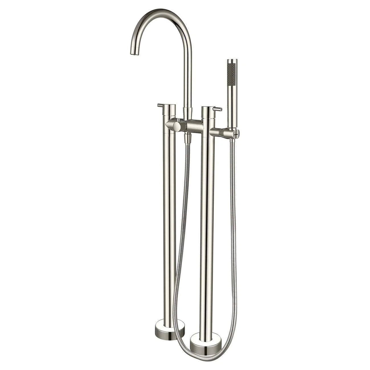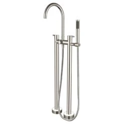 This modern tub faucet from Randolph Morris offers the perfect balance of practical design and aesthetic appeal. This contemporary freestanding tub faucet has a double post design that is sure to make a lasting impression. Smooth, drip-free flow and a handshower featuring a backflow preventer ensure optimal function, and you’re sure to appreciate the sleek construction of this double post freestanding tub faucet, available in several neutral and metallic finishes. This contemporary fixture features a wand-style hand shower and a swivel gooseneck spout. Constructed of premium quality solid brass with a rust-resistant finish complete the look of this freestanding faucet.