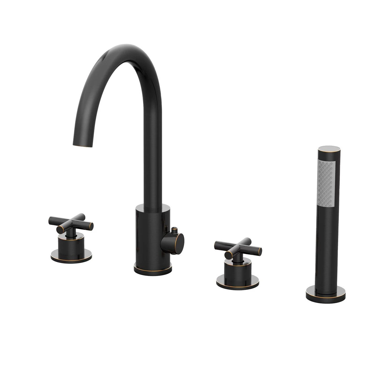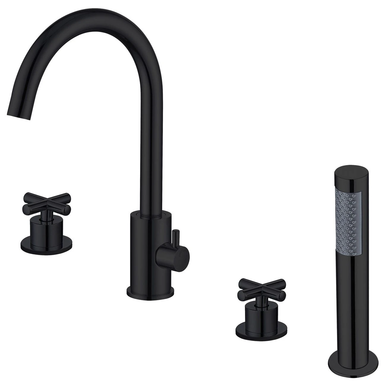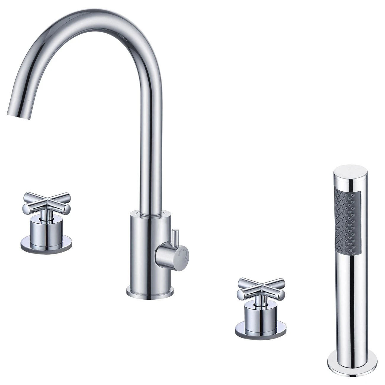 Make a big statement with this roman tub faucet. The high gooseneck spout features a striking cylindrical design that carries over to its cross handles and wand-style hand shower. Built to last, this bathtub faucet is made from solid brass and features a tarnish and corrosion-resistant finish.