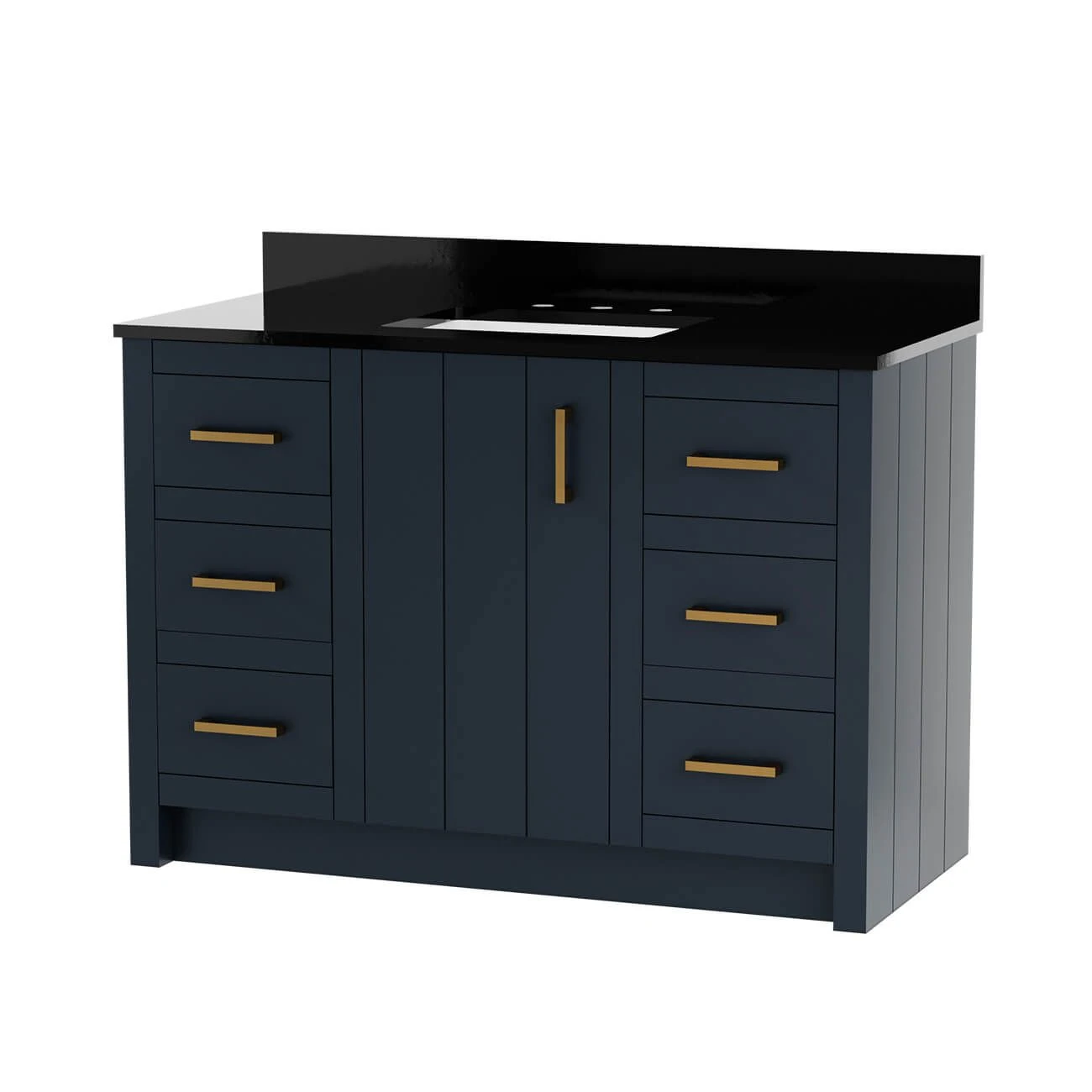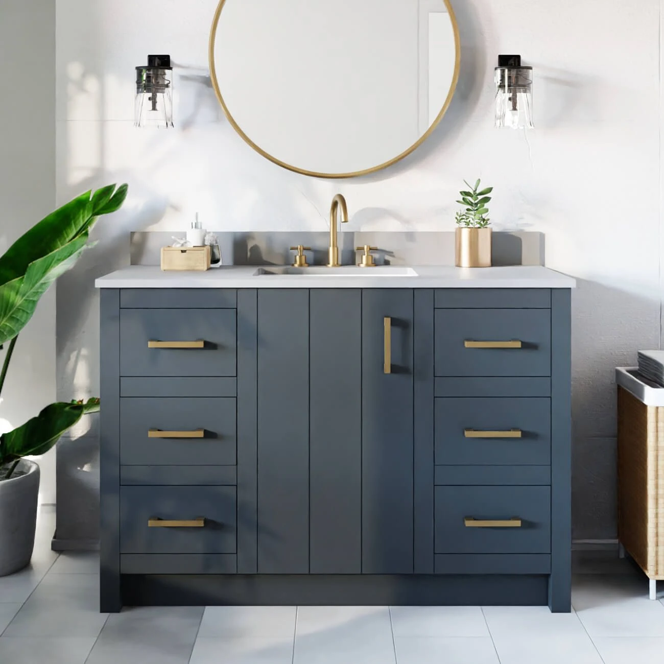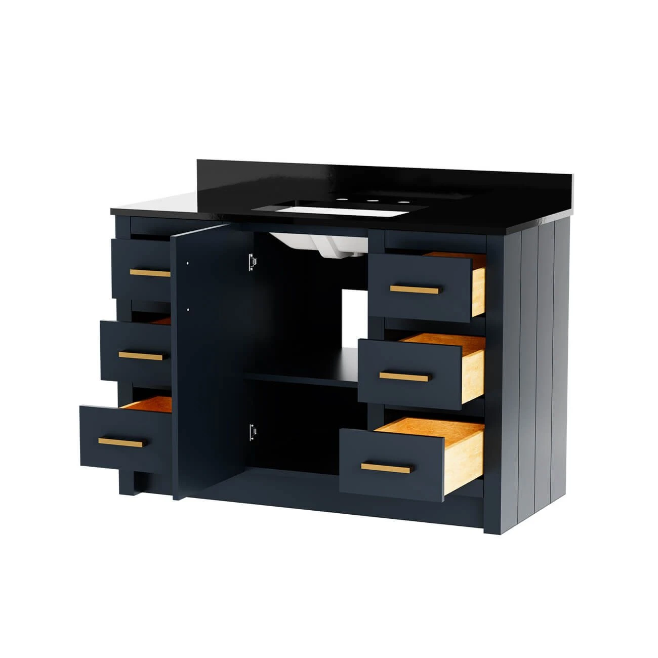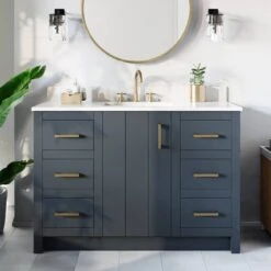 The Cora 48-Inch Bathroom Vanity will be a jaw-dropping addition to your bathroom. The navy blue finish and sleek vertical slatted design will give your bathroom the added wow factor it’s been craving. The size is perfect for a guest, children’s, or a smaller master bathroom. Three spacious drawers line each side of the vanity, while the center features a vertical slatted door that opens to reveal a large interior with a shelf. Made of solid oak, the Cora Bathroom Vanity will hold up to the demands of everyday use.