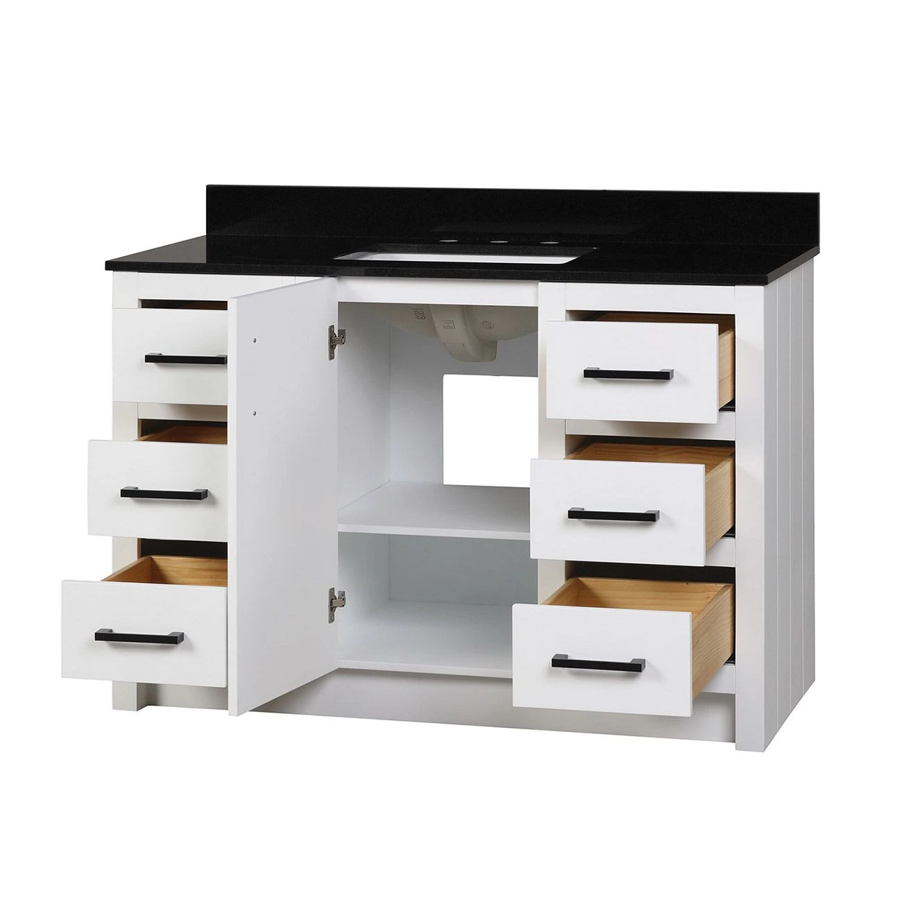 The Cora Single Bathroom Vanity is the perfect addition to a guest, children’s, or smaller master bathroom. The white finish provides a clean, simple, airly look, while the black hardware offers an upscale, contemporary design. Each side of the vanity is lined with three spacious drawers, and the center door opens to reveal a large storage area with a shelf. Constructed from solid oak, the Cora Vanity is designed for the wear and tear of everyday use.