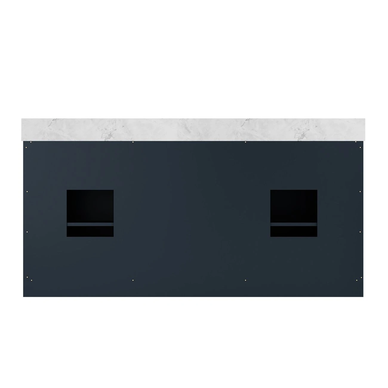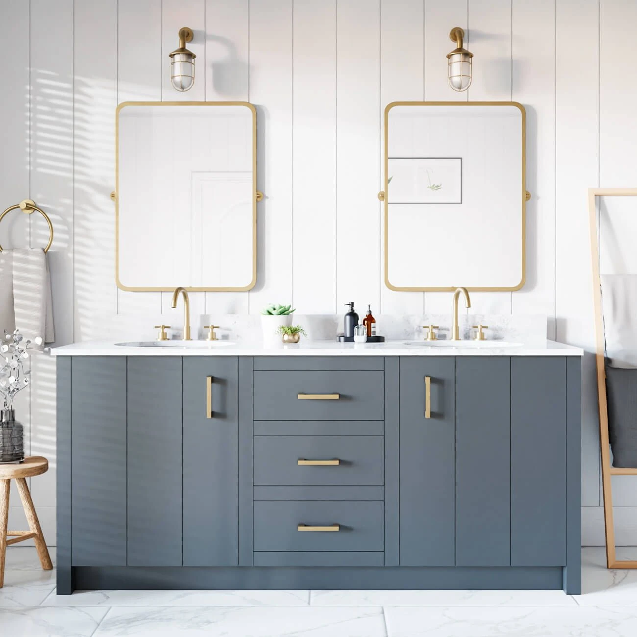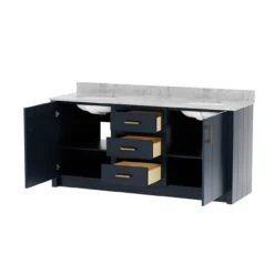 Give your master bathroom suite a fresh new look with the Cora 72-Inch Bathroom Vanity. This double bathroom vanity boasts a navy blue finish with gold pull-style hardware that will become the focal point of your bathroom. Three ample drawers offer plenty of room for keeping the countertop free of clutter. Each side of the vanity features a vertical slatted door, which opens to reveal a large storage area with a shelf that’s perfect for storing towels and other necessities.