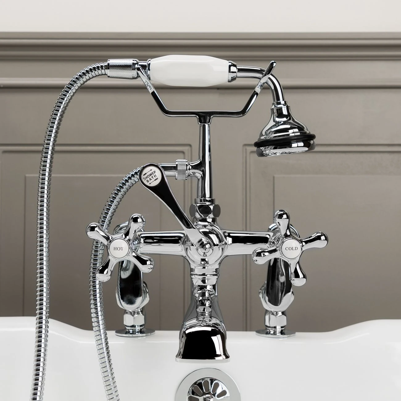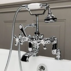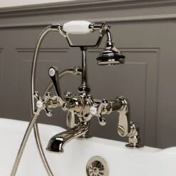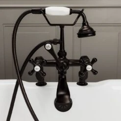 Create a seamless look in your bathroom with this elegant deck mount tub faucet. Featuring shapely cross handles with porcelain lettered inlays, hand shower with porcelain handle, and a low spout, this bathtub faucet will be the highlight of your bathtub.