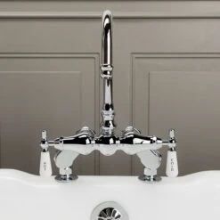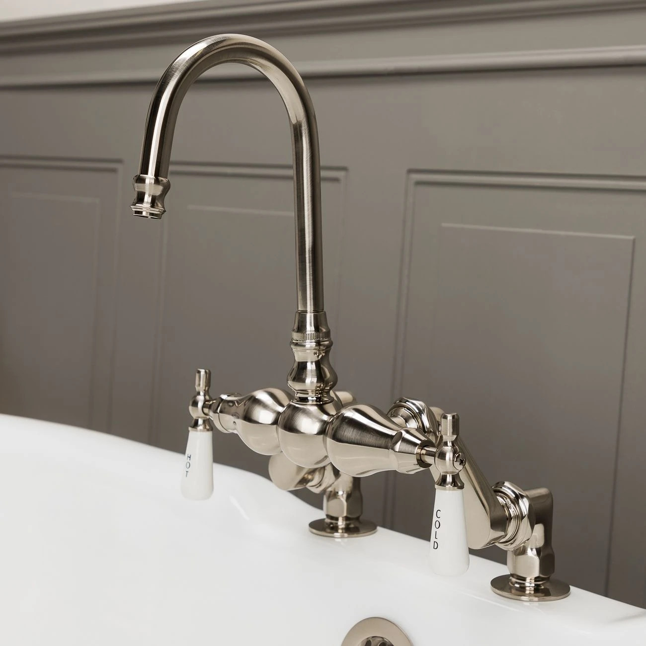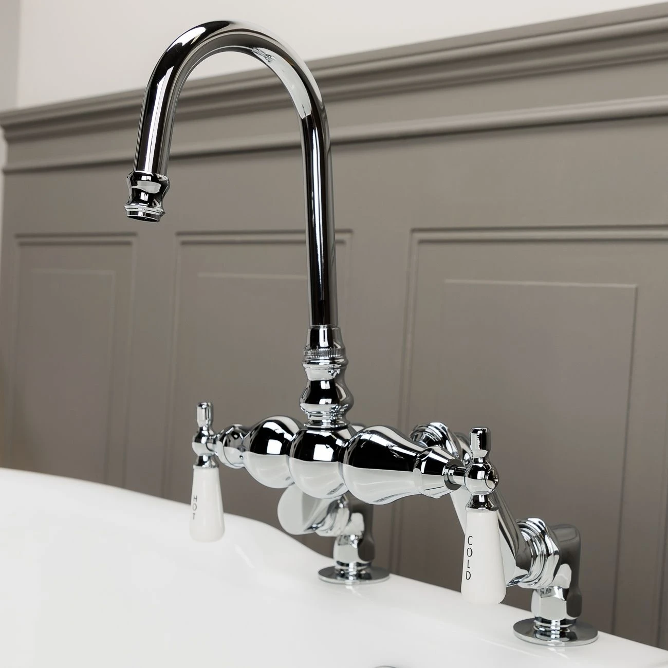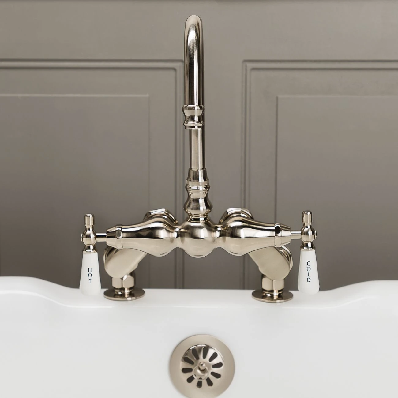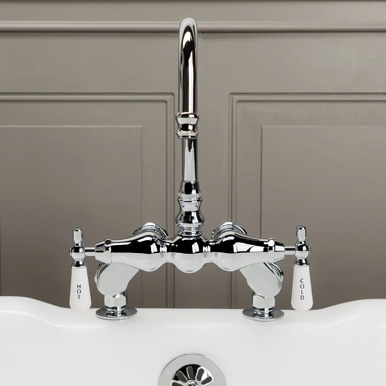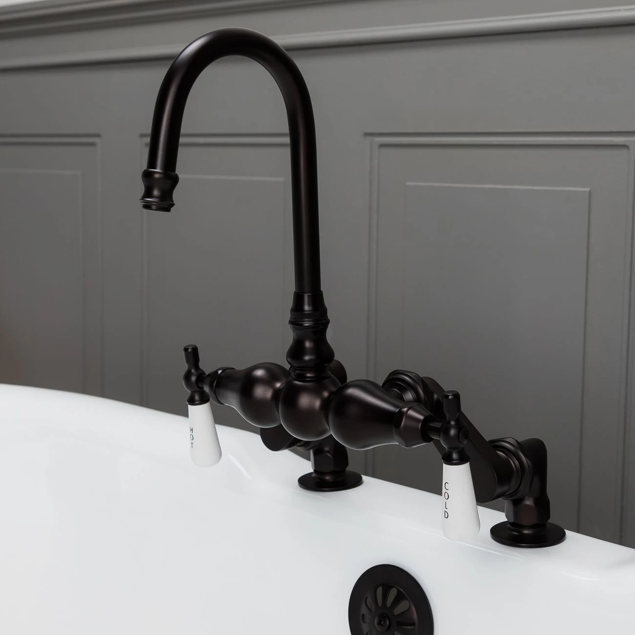 A deck-mounted clawfoot tub faucet is the perfect addition for your clawfoot or freestanding tub. With a high-arching gooseneck spout and lettered porcelain lever handles, this rim-mounted bathtub faucet will leave a lasting impression. Solid brass construction ensures long-lasting durability and a rust-resistant finish.