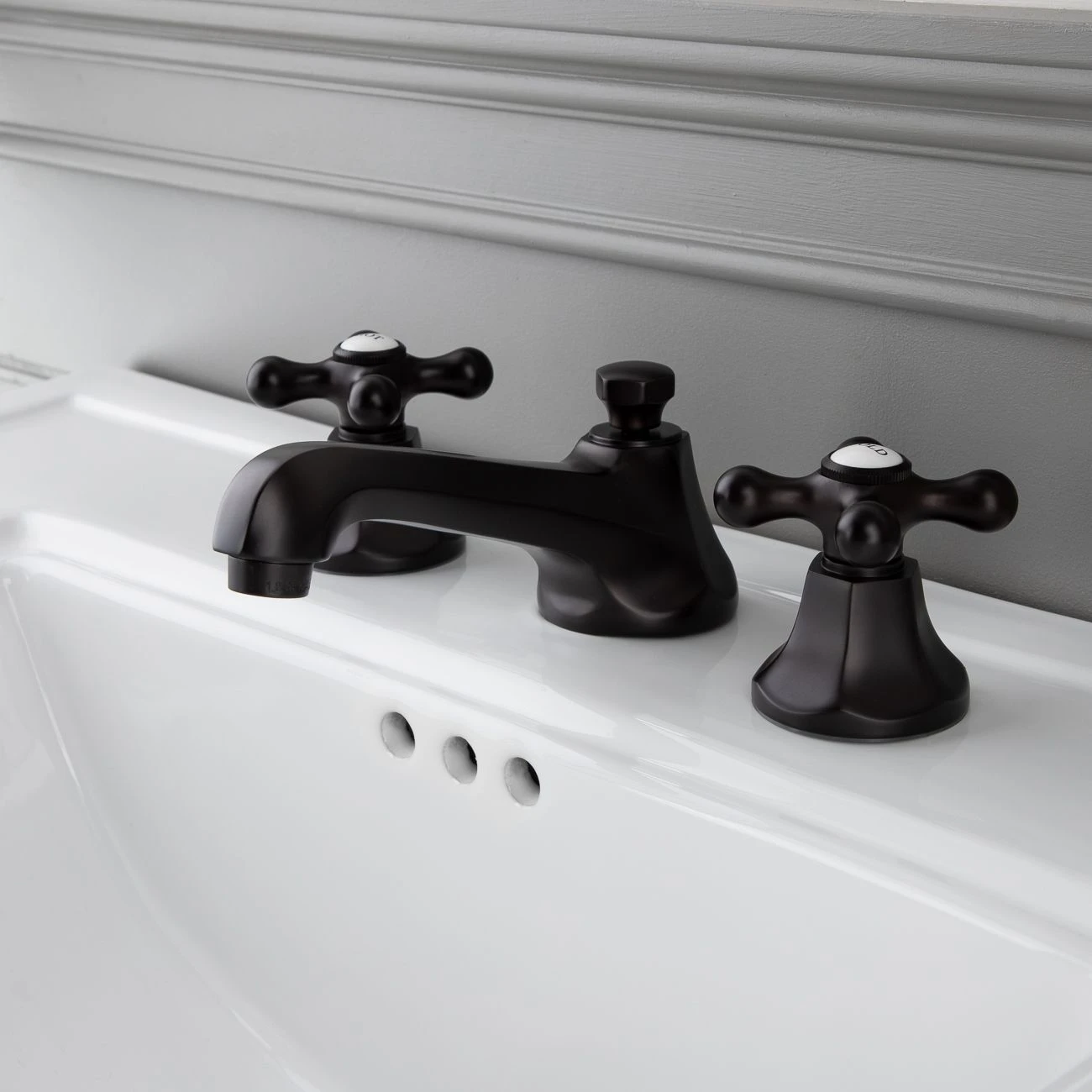 The classic metal cross handles of this unique deco bathroom sink faucet feature porcelain insets lettered with hot and cold for a traditional look. This widespread faucet will help to blend contemporary accents with a traditionally styled bathroom. With a solid brass construction, this deco sink remains lead-free.