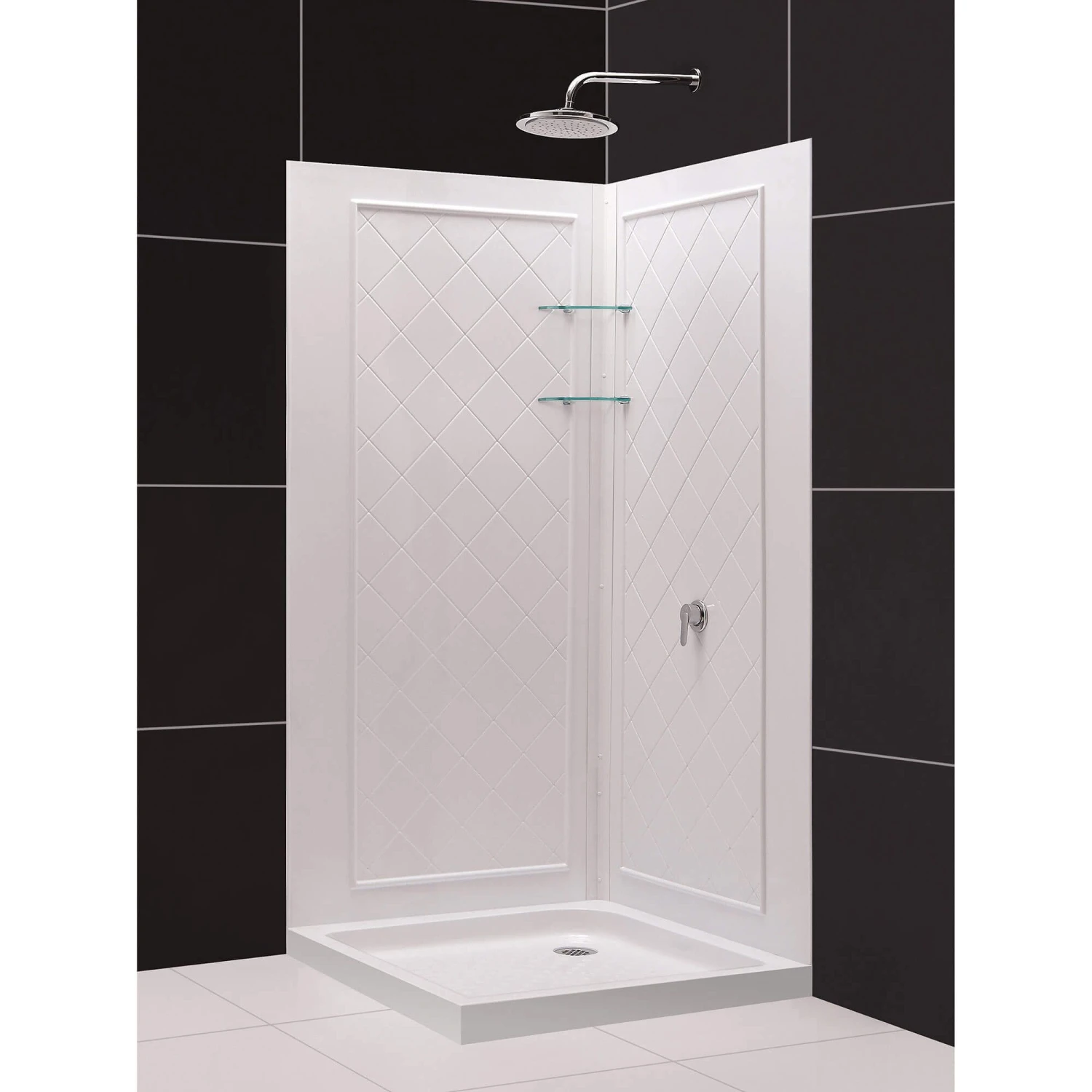 - Hardware Finish: Chrome; Base and Backwall Color: White; Drain Location: Corner