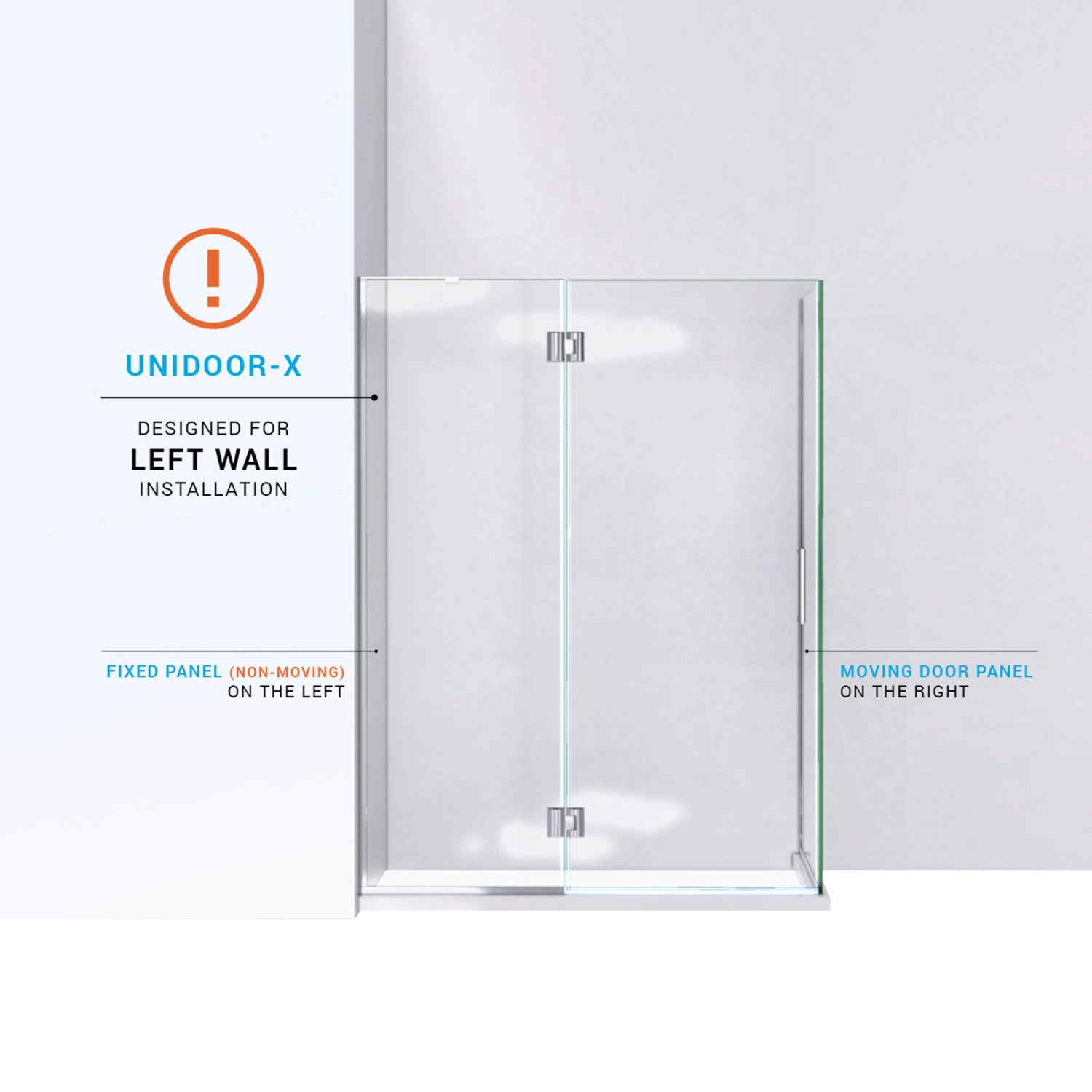 The DreamLine Unidoor-X is a frameless shower door, tub door or enclosure that features a luxurious modern design, complementing the architectural details, tile patterns and the composition of your bath space. Unidoor-X showcases sleek, clean lines to enhance any shower space, creating a stunning appearance. DreamLine exclusive ClearMax water repellant and stain resistant glass coating adds superior protection from stains and is nearly maintenance-free. Unidoor-X is part of DreamLine Unidoor collection, the most versatile line of shower doors and enclosures on the market.