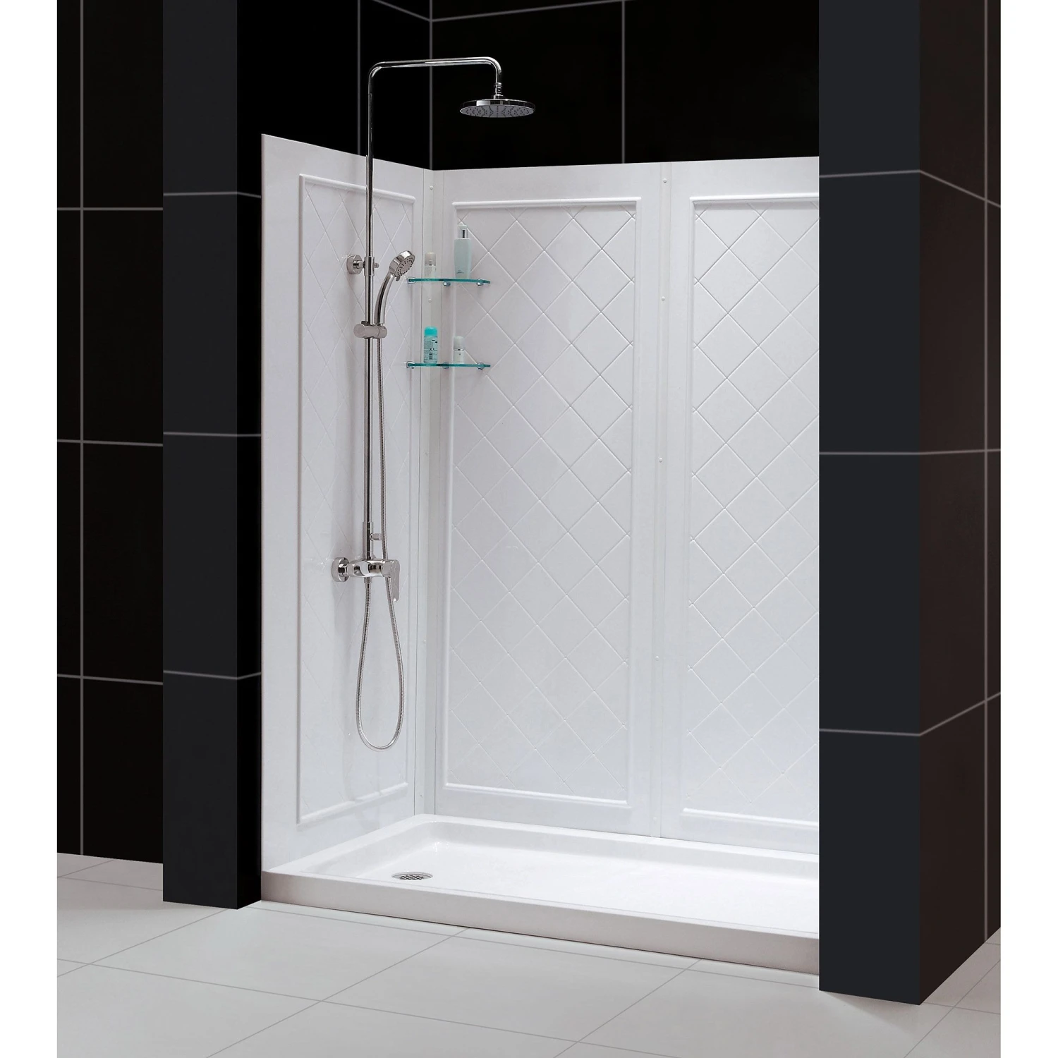 - Hardware Finish: Chrome; Base & Backwall Color: White; Center Drain (Centered on width only, see technical drawing for exact drain location)