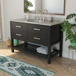 The sleek 48-inch Everett Vanity in black is perfect for your next bathroom update. Expertly crafted, featuring two functioning soft close drawers and a slatted shelf underneath, all your toiletries and linens are within reach. Finished with brushed nickel hardware, this modern bathroom vanity will implement style and satisfaction in your bathroom.