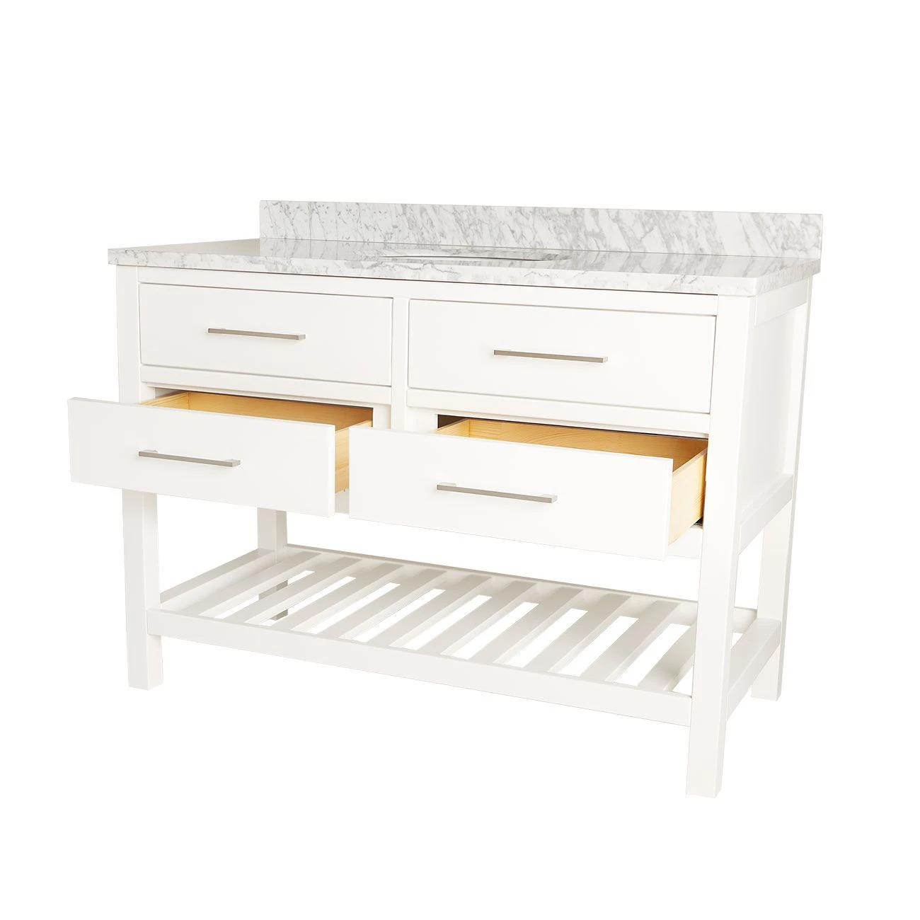 Add the perfect finishing touch to your master bathroom with the 48-inch modern Everett Bathroom Vanity. Featuring two soft-close drawers and a long slatted shelf underneath, this console bathroom vanity has enough space to fit all your towels and toiletries. Brushed nickel pull-style handles add an elegant finish to this gorgeous white vanity. Made of solid oak with a white granite counter, the Everett Vanity is the perfect addition to your bathroom.