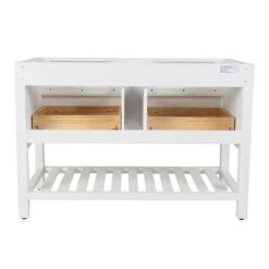 Add the perfect finishing touch to any bathroom with the single sink Everett Console Vanity. Featuring two soft-close drawers and a long slatted shelf underneath, this console bathroom vanity has enough space to fit all your towels and toiletries. Brushed nickel pull-style handles add an elegant finish to this gorgeous white vanity. Made of solid birch and oak with your choice of counter, the Everett Vanity is the perfect addition to your bathroom. Complete the look with an LED mirror and your choice of bathroom sink faucet.