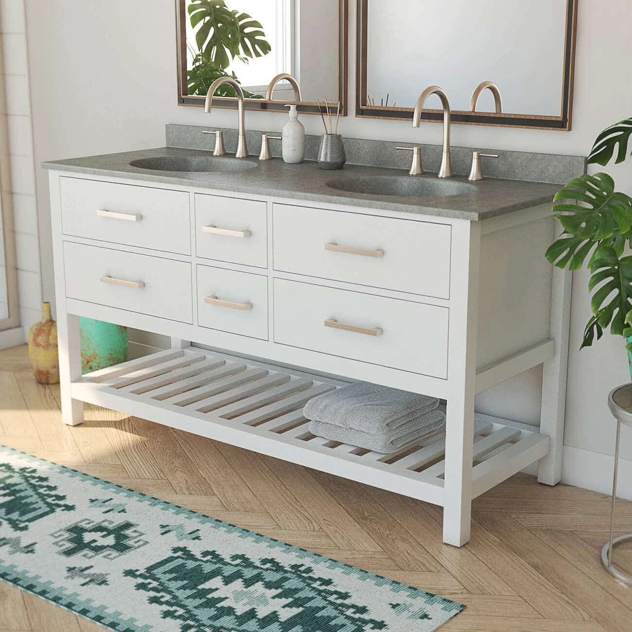 The Everett Vanity is a great addition to your master bathroom. Comprised of six soft close drawers with brushed nickel pull style handles, the Everett Vanity has a versatile look for any style bathroom. A long slated shelf underneath runs the length of the vanity, providing ample space for toiletries. An expertly crafted solid oak constructed sealed with a protective lacquer ensures this bathroom vanity is built to last. Add two widespread bathroom sink faucets to complete the look.