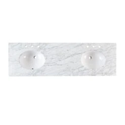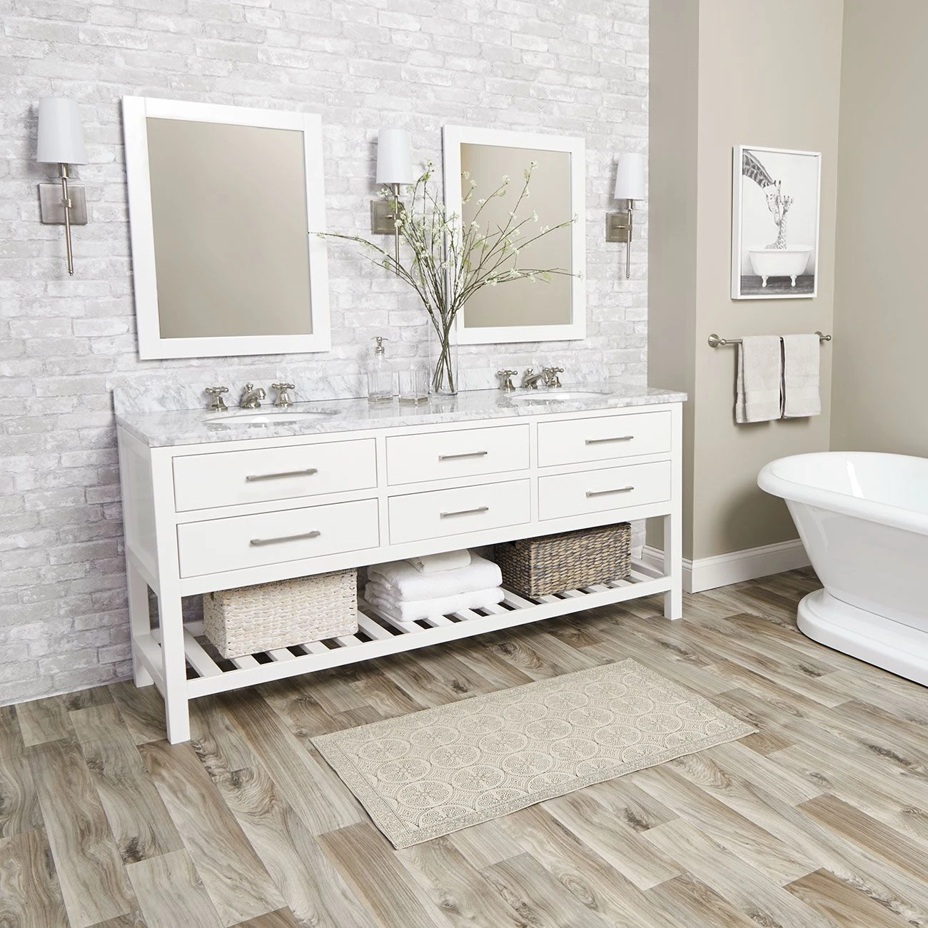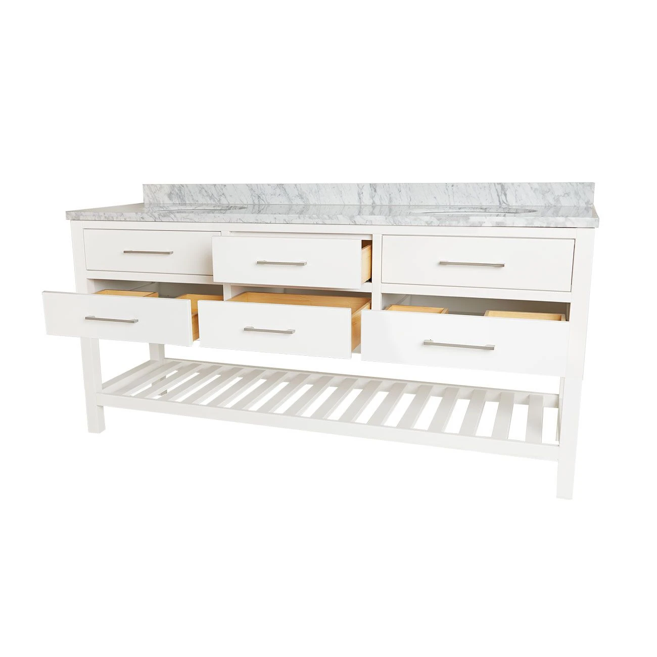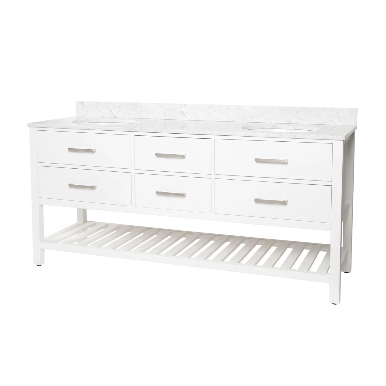 The 72-inch Randolph Morris Everett Bathroom Vanity is an excellent way to incorporate contemporary design in your next bathroom update. Four drawers and a long shelf offer plenty of space for all your bathroom essentials. Featuring brushed nickel pull-style handles and soft-close drawers, this modern bathroom vanity combines smooth, quiet functionality with expertly crafted modern design.