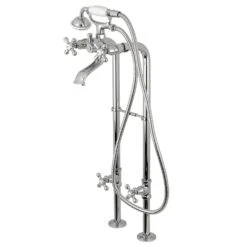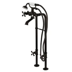 Unity in balance and support is what this freestanding tub faucet embodies with an included supply line, stop valve and handle from the Kingston Collection. Composed from solid brass material, this tub and shower set features a floor-mount installation and spout water flow rate of 7.0 GPM/26.5 LPM at 80 PSI, while the hand shower provides a water flow rate of 1.8 GPM/6.8 LPM at 80 PSI. Excellence of endurance and reliability is emboldened by a corrosion-resistant finish, embellish your home ensemble with this tub faucet and parts set.