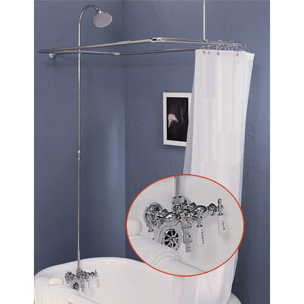 - Tub fill faucet with porcelain lever handles, riser, shower head, shower ring, and supports