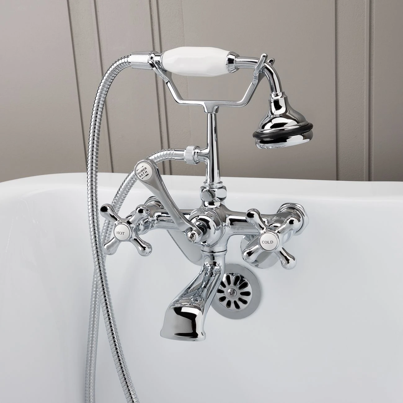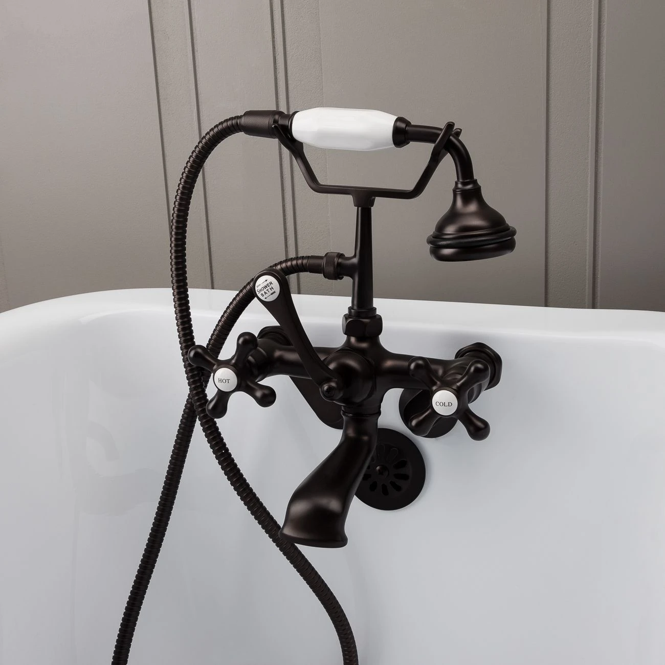 This low spout clawfoot tub faucet is a must-have addition to any clawfoot tub. Designed to mount to the wall of the bathtub, this faucet features a stately low spout, metal cross handles with premium porcelain lettered inlays, and a British telephone-style hand shower with a porcelain handle. Solid brass construction ensures lasting durability, while ceramic quarter-turn valves offer smooth, drip-free operation, offering endless relaxation.