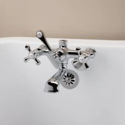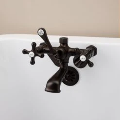 You’re sure to love the low spout of this British telephone clawfoot tub faucet, designed to keep splashing water in the tub. Add simple elegance to your clawfoot tub with this low spout clawfoot tub faucet. Solid brass construction ensures years of long-lasting durability. The premium metal cross handles with porcelain lettered inlays add to the beauty. The ceramic quarter-turn valves offer a smooth drip-free bathing experience. A traditional design, as vintage clawfoot tub faucets go, this unique Randolph Morris model is available in a range of premium metallic finishes suited to any bathroom style.