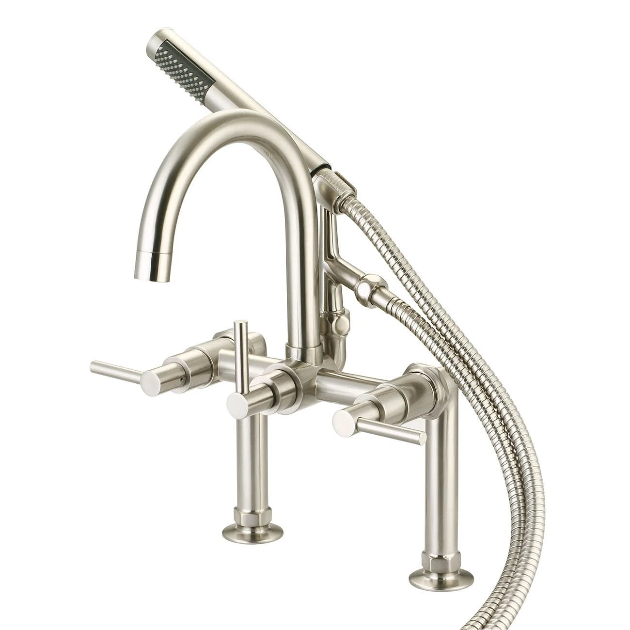This modern deck mount bathtub faucet with hand shower is the perfect addition to your freestanding or clawfoot tub. Available in three sleek finishes, this deck-mount tub faucet with sprayer is the perfect complement to the modern gooseneck sink in your bathroom, as well as a range of contemporary hardware designs. It features a simplistic cylindrical design that complements a modern bathroom. Constructed of solid brass, metal lever handles, and a hand shower, this bathtub faucet is a stylish addition to your space. If you’re looking for a clawfoot tub gooseneck faucet that’s lovely and refined with the function of a hand shower, this design is ideal.