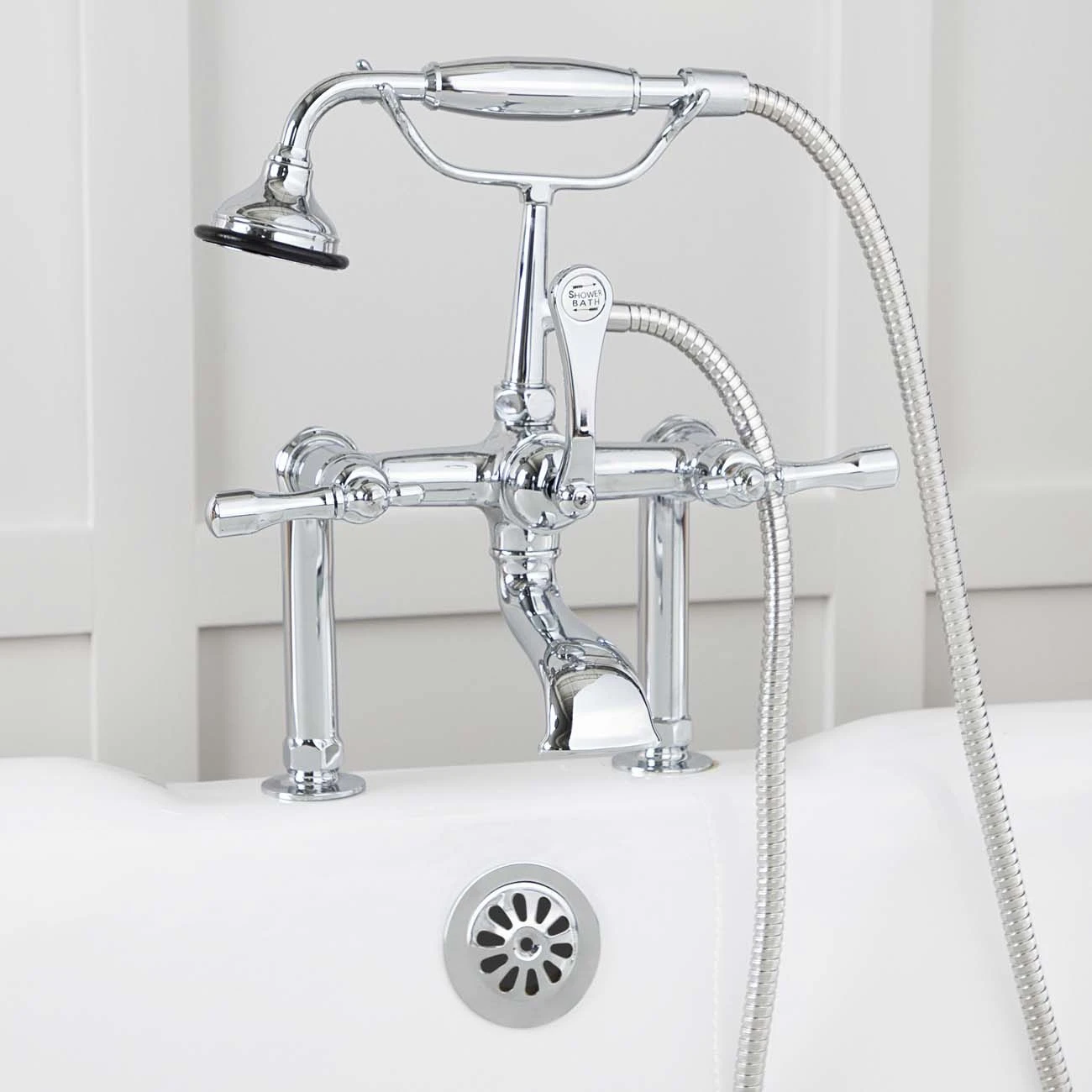 This deck mount clawfoot tub faucet from the Mason Hill Collection will bring traditional charm to your bathroom. Featuring an English telephone style hand shower, metal lever handles, a shower diverter with a porcelain inlay, and a traditional low spout, this deck mount faucet is perfect for your clawfoot or freestanding tub. The solid brass construction ensures the faucet will remain beautiful for years to come.