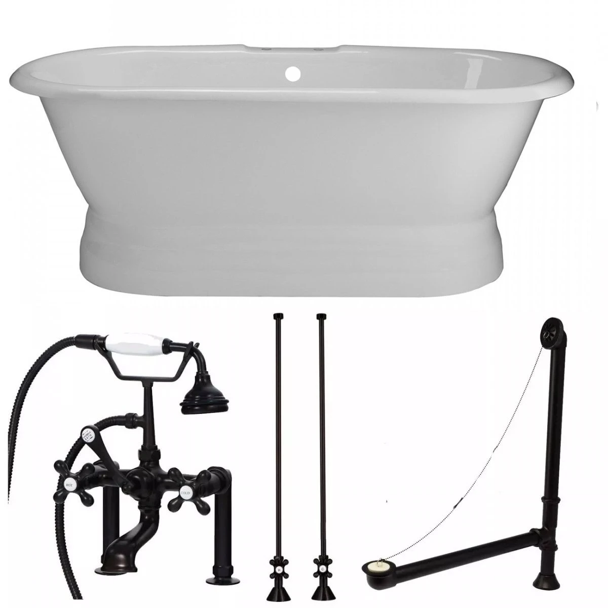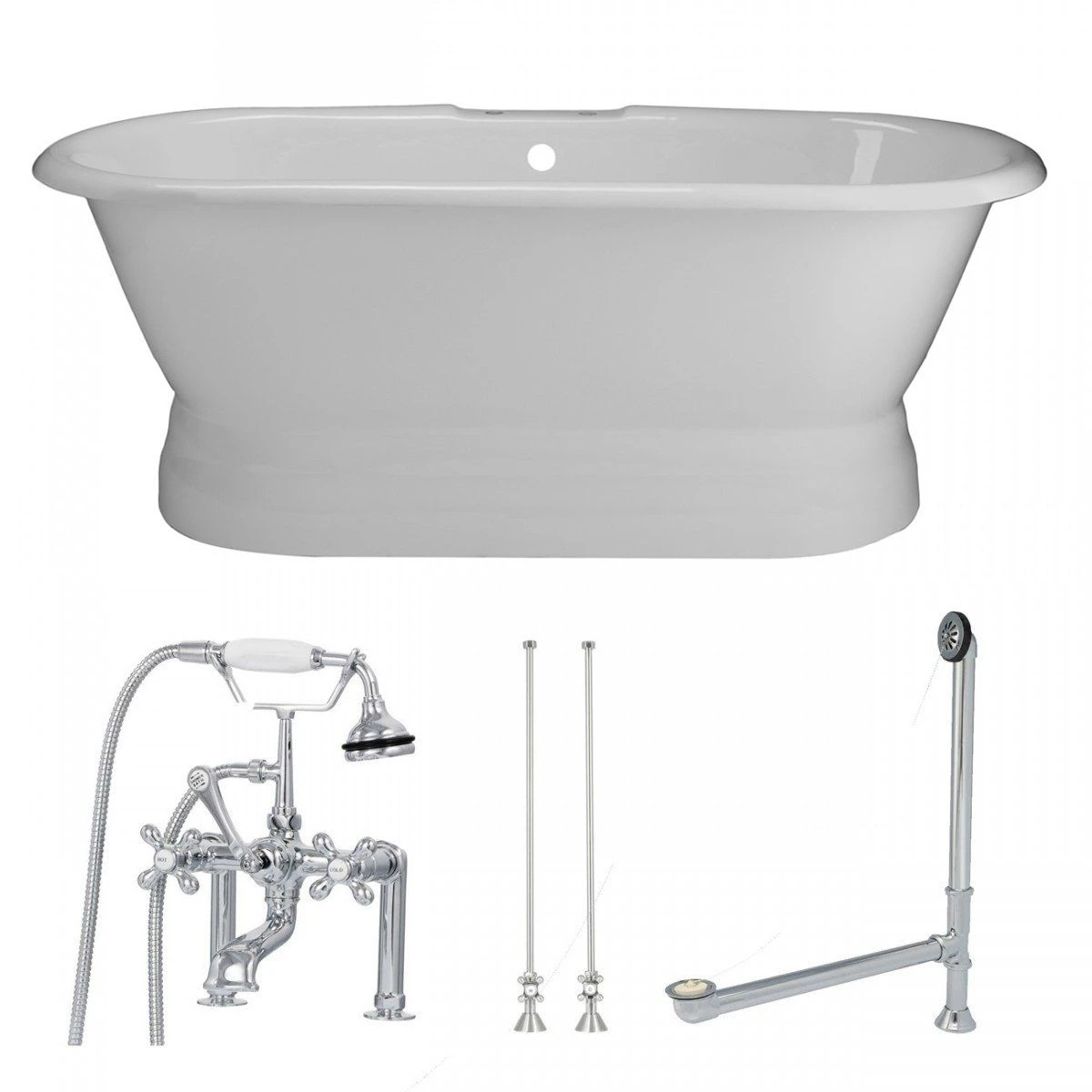 - Package includes: Cast Iron Double Ended Pedestal Tub, Tub Rim Mount British Telephone Tub Faucet with Handshower, Chain & Stopper Drain, and Clawfoot Tub Straight Supply Lines with Shut Off Valves