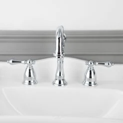 The classic lines of this victorian style faucet will make a statement in your bathroom. A solid brass, lead-free construction with metal lever handles offers long-lasting durability and great functionality. This sculpted faucet body is shapely and classic, perfect for a bathroom vanity or pedestal sink.
