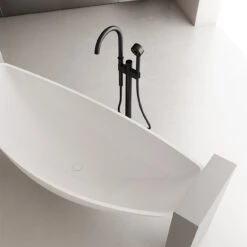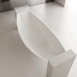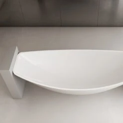 This 79-inch floating hammock tub creates a uniquely modern look that is hard to achieve. Randolph Morris constructs this modern tub from high-glass, stain-resistant acrylic that won’t scratch or fade over time. This floating bathtub drains directly to the floor, pairing well with a wet room shower drain.
