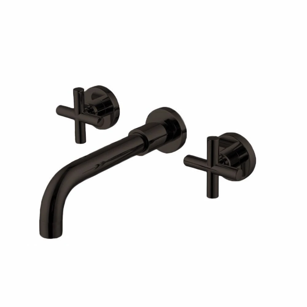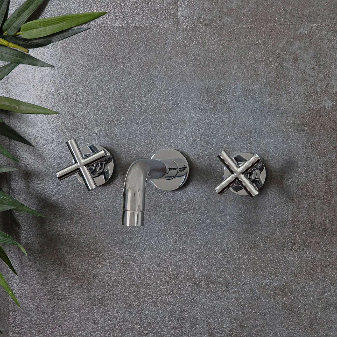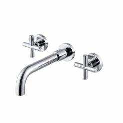 Simple yet stately, this wall mount bathroom sink faucetwill make a statement in your master bathroom. The sleek design is the perfect complement for a contemporary tub. Premium cross handle knobs feature porcelain lettered inlays, and solid brass construction ensures long-lasting durability.