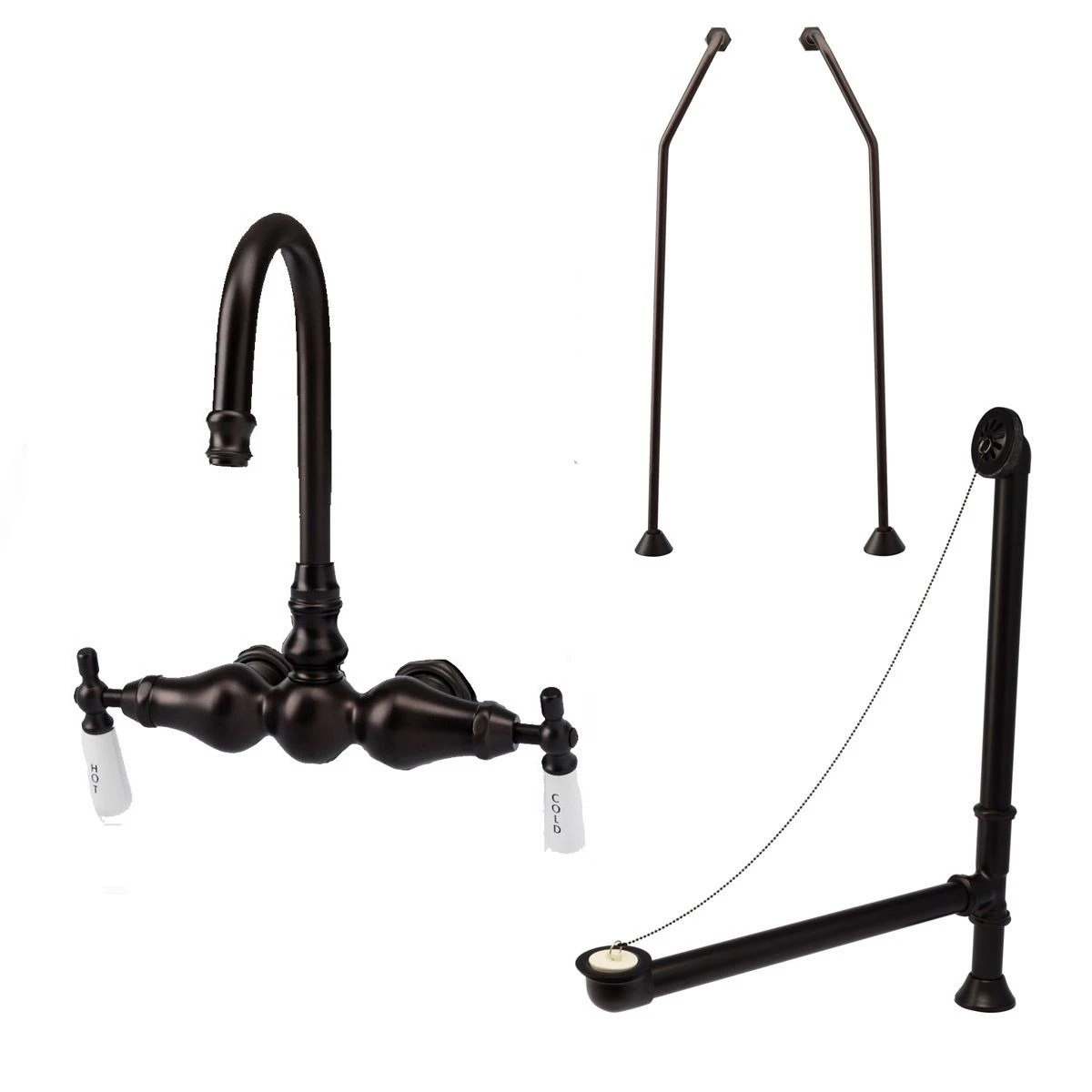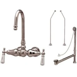 This traditional faucet set provides everything needed to install the faucet to the wall of your clawfoot tub. In addition to the faucet, each set includes a chain and stopper drain and double offset supply lines. The faucet features a classic three-ball design with upscale porcelain lettered lever handles and a high gooseneck spout.